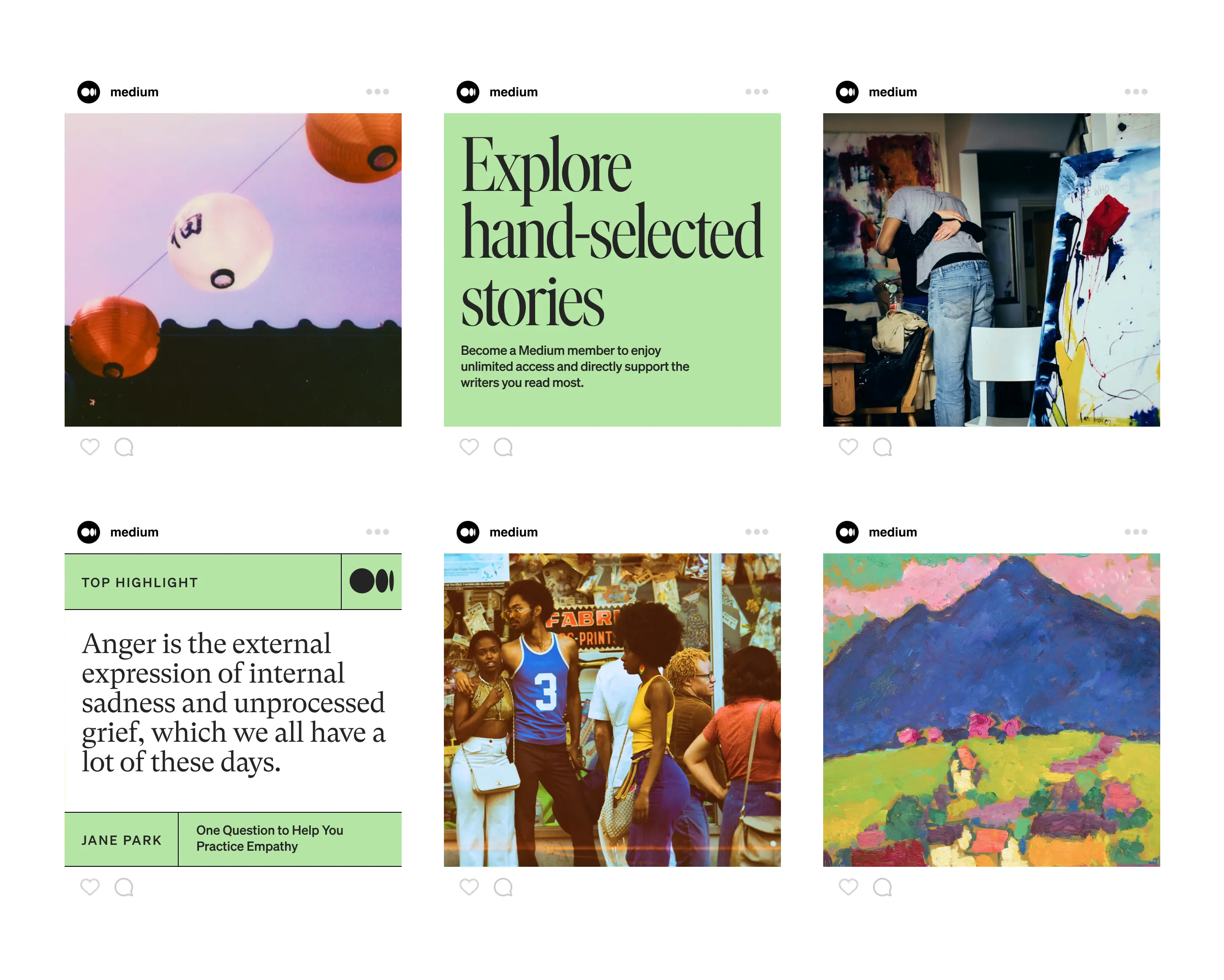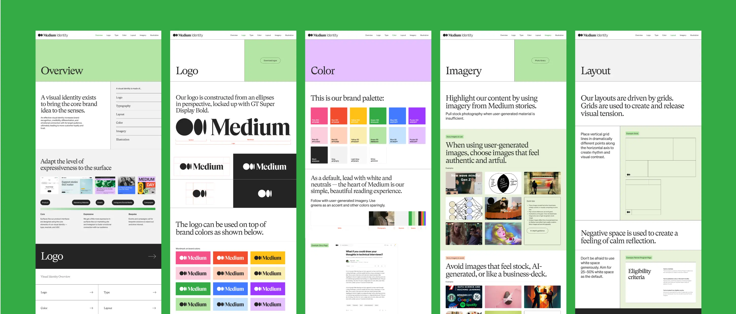 Medium is known for thoughtful writing and strong editorial taste. As the platform scaled, applying that identity consistently across product and marketing grew more complex. Our role was to reinforce what already made the brand distinctive and make it easier to use across teams. We preserved core elements of typography, grid, and layout while tightening consistency across applications. Color and imagery shifted to better foreground writers and their voices. Behind the scenes, we built practical tools, templates, and systems that made the brand easier to apply across teams and touchpoints.